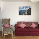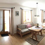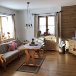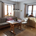 - Wohnraum mit Essecke, Couch und Fernsehstuhl mit Fußablage